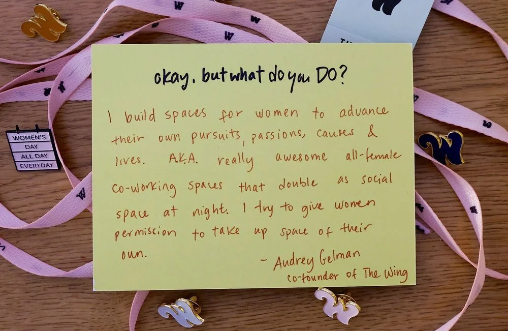 Okay, But What Do You Do?: I build spaces for women to advance their own pursuits, passions, causes & lives. AKA really awesome all-female co-working spaces that double as social space at night. I try to give women permission to take up space of their own.