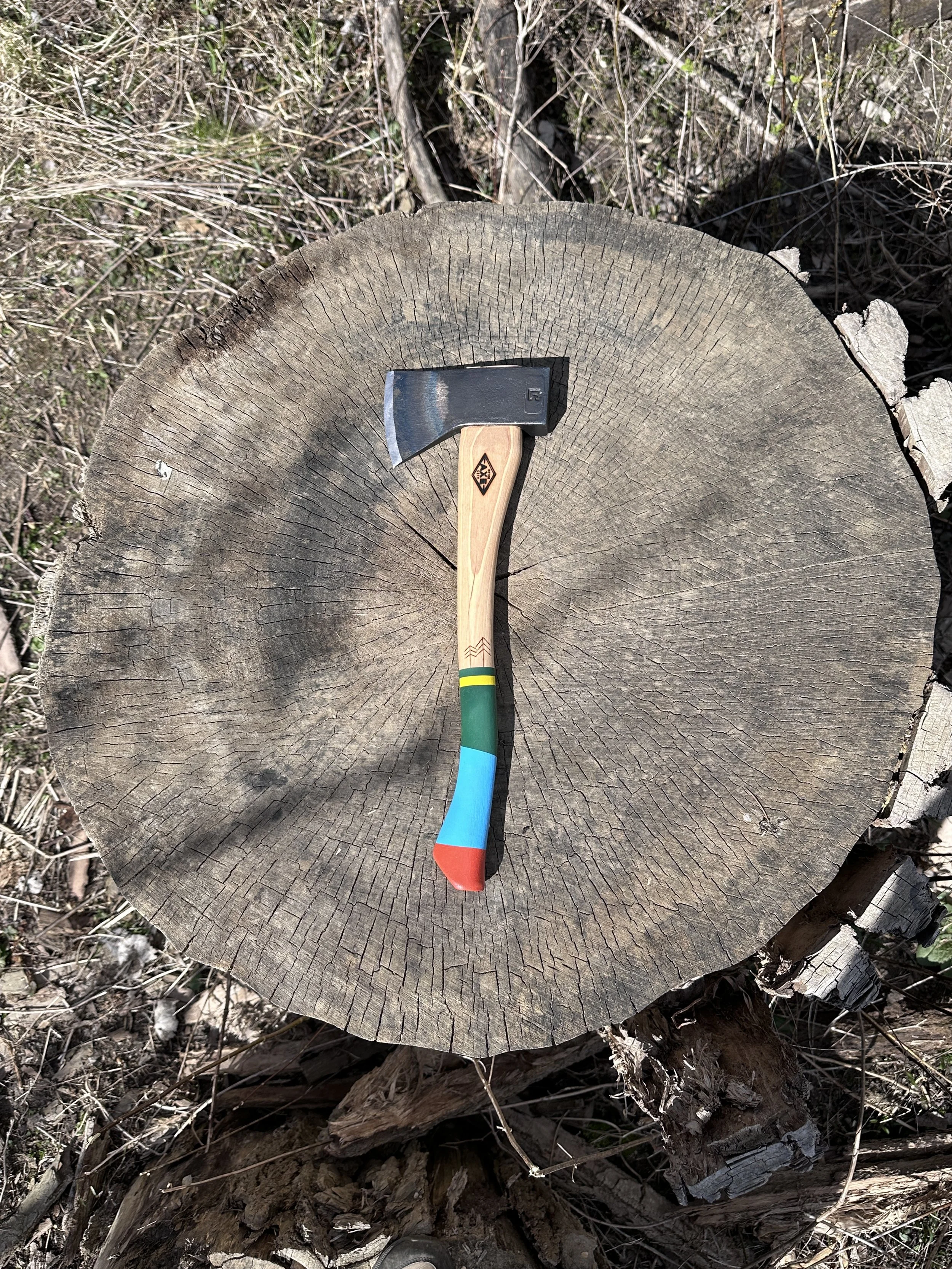 There's two lines of the business: we're making and refinishing. I have a handful of people, my parents included, but family friends, my friend's mom, my cousin's wife's dad [who are] avid garage sale-ers. They will go out and grab old tools, axes, any tool that has a wooden handle. I even do hammers, screwdrivers, a full refurbish process on those. Cleaning all the rust off, sharpening, a new handle, make sure the handle is tight and everything is secure. Then I work with a company out of North Carolina who makes all of the new axes for me. I'm just doing the hand painting and design on those new axes, no official forging done on my end.
