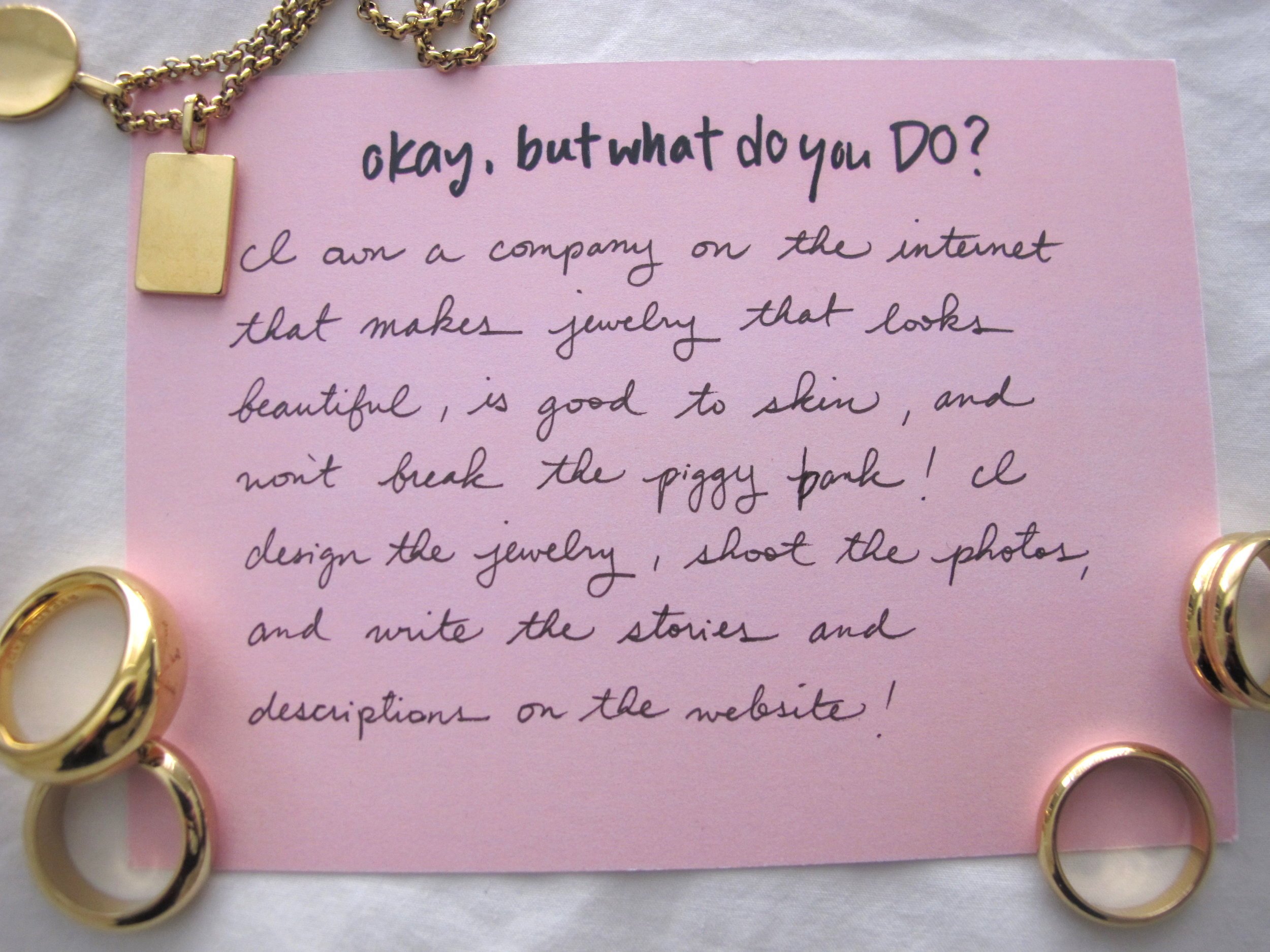 Okay, But What Do You Do?: I own a company on the internet that makes jewelry that looks beautiful, is good to skin, and won’t break the piggy bank! I design the jewelry, shoot the photos, and write the stories and descriptions on the website!