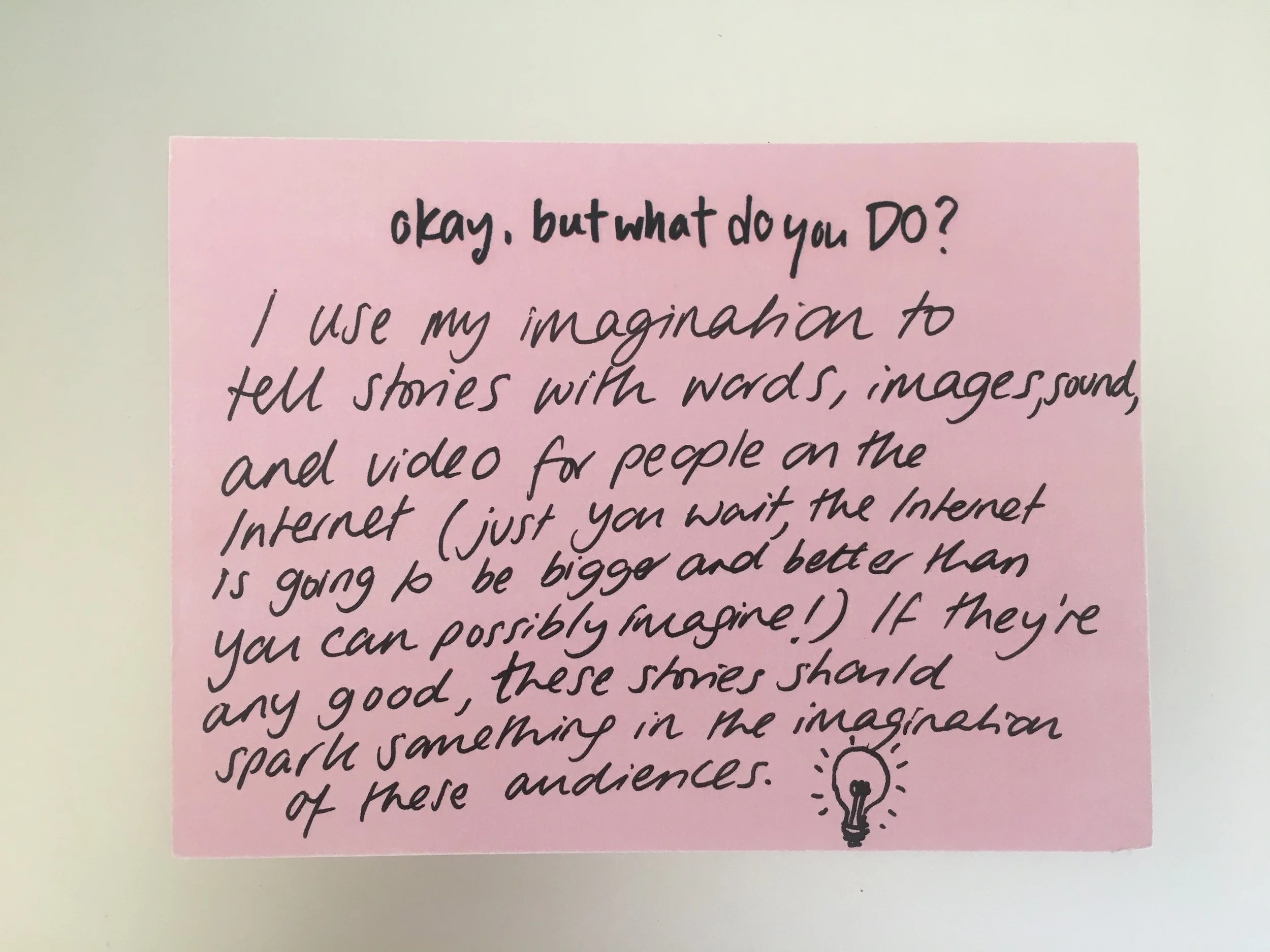 Okay, But What Do You Do?: I use my imagination to tell stories with words, images, sound, and video for people on the internet (just you wait, the internet is going to be bigger and better than you can possibly imagine!) If they’re any good, these stories should spark something in the imagination of these audiences.